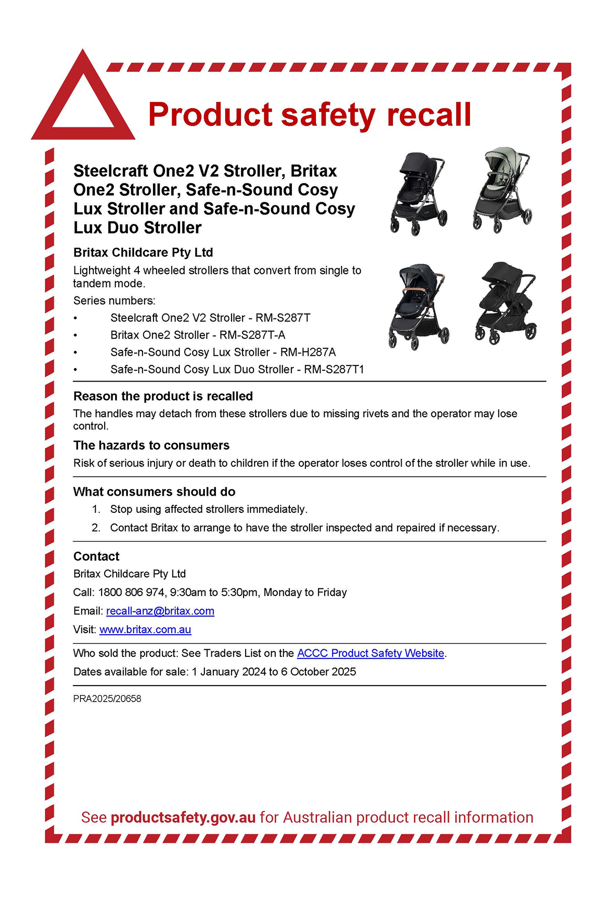 Contact Details: Britax Childcare Pty Ltd | 1800 806 974 | 9:30am to 5:30pm, Monday to Friday | recall-anz@britax.com | visit: www.britax.com.au