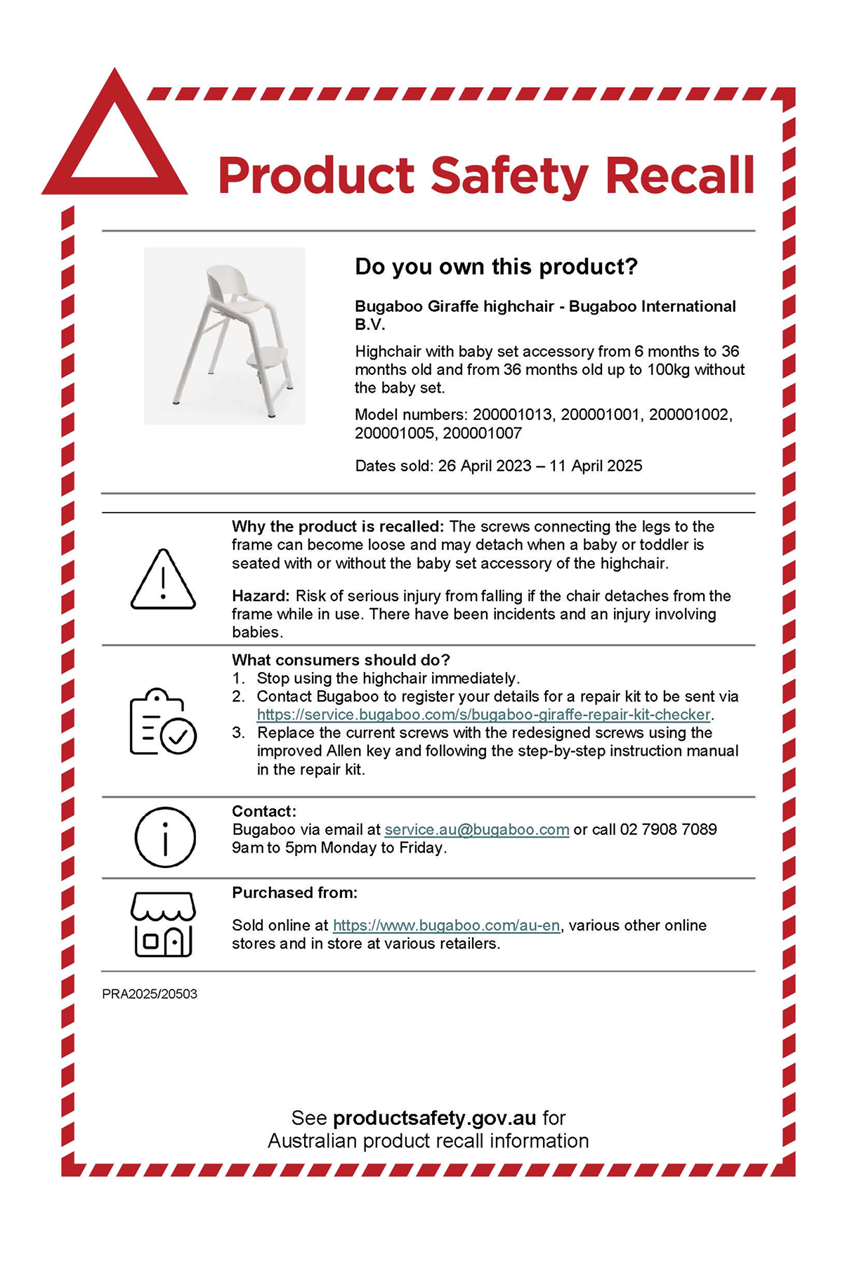 2. Return the highchair for a refund to your local Baby Bunting Store or, contact Bugaboo to register your details for a repair kit to be sent via https://service.bugaboo.com/s/bugaboo-giraffe-repair-kit-checker.