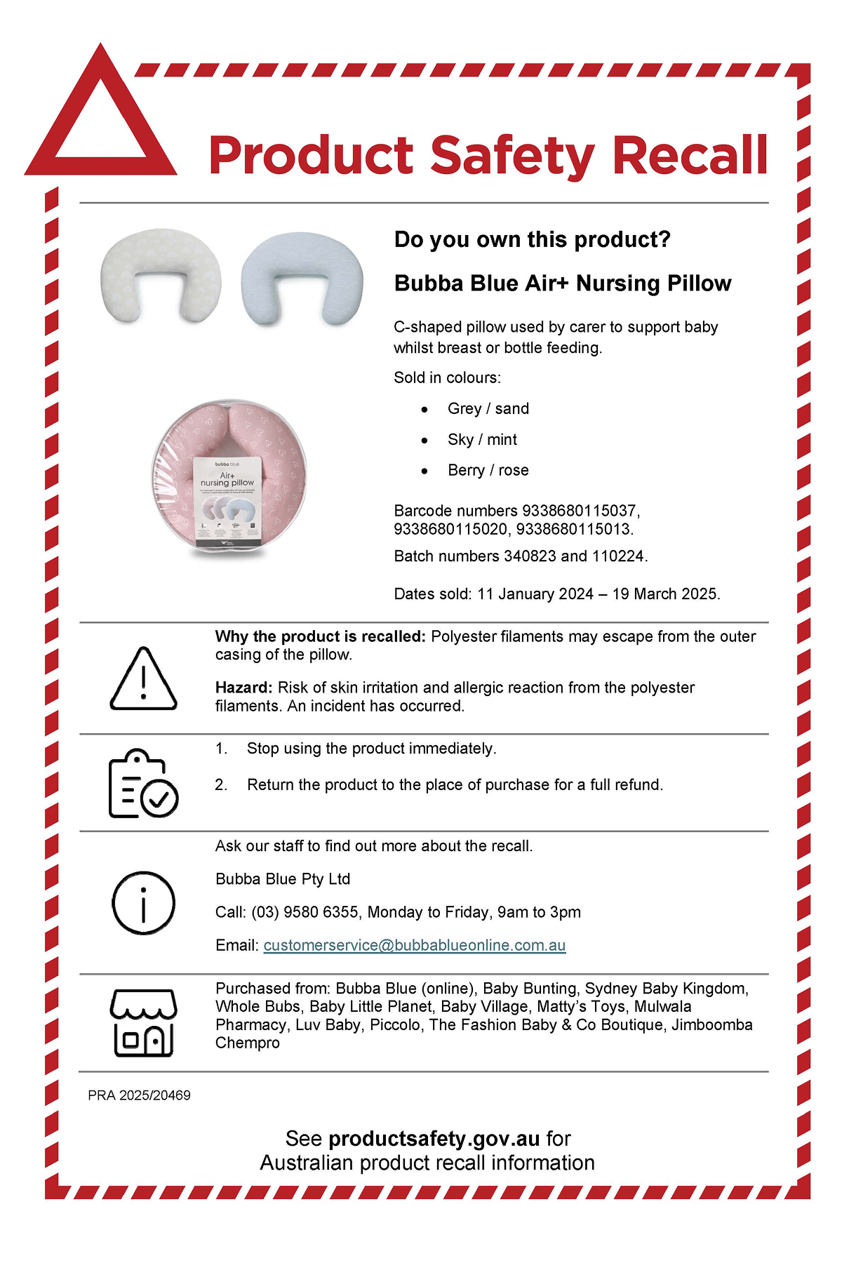 Products Affected: Bubba Blue Air+ Nursing Pillow Grey/Sand, Sky/Mint and Berry/Rose